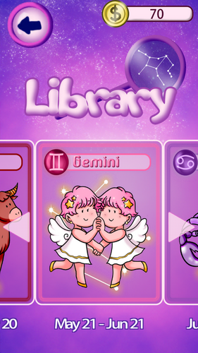 An educational game about star signs. Guess the star signs and their best matches to unlock coins that can be used to purchase cosmetic items and library items.